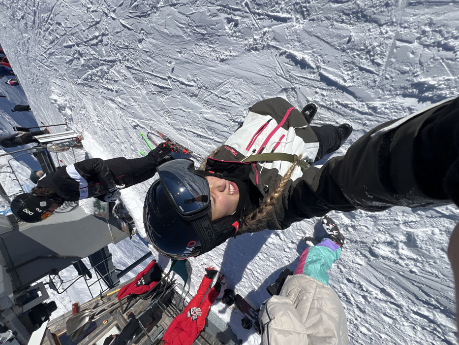 The image displays a sunny winter day on a snow-covered ski slope in Tignes, France. The primary subject, a female, is positioned in the foreground, taking a low-angle selfie. She wears a black ski helmet with Uvex goggles, a white and pink Rehall brand ski jacket, black ski pants, and black ski boots. Her long blonde hair is braided and visible below the helmet. Her expression appears to be a grimace. Behind and to the left of the main subject, another individual stands on skis, wearing a black POC helmet, a black ski jacket with white horizontal stripes, and black ski pants. This person is looking downwards, possibly adjusting equipment. Further to the left, a grey metallic ski lift structure is partially visible, alongside a wooden building. A person in red ski attire is partially visible near the building, and a red jacket is draped over an unseen object. In the bottom-left corner, the lower body of a third person is visible, wearing light beige pants and multi-colored (mint green, pink, purple) ski pants, with black ski boots on a snowboard or skis. The snow-covered terrain features numerous ski tracks. In the upper background, additional skiers and distant mountains are visible under a clear, bright sky.