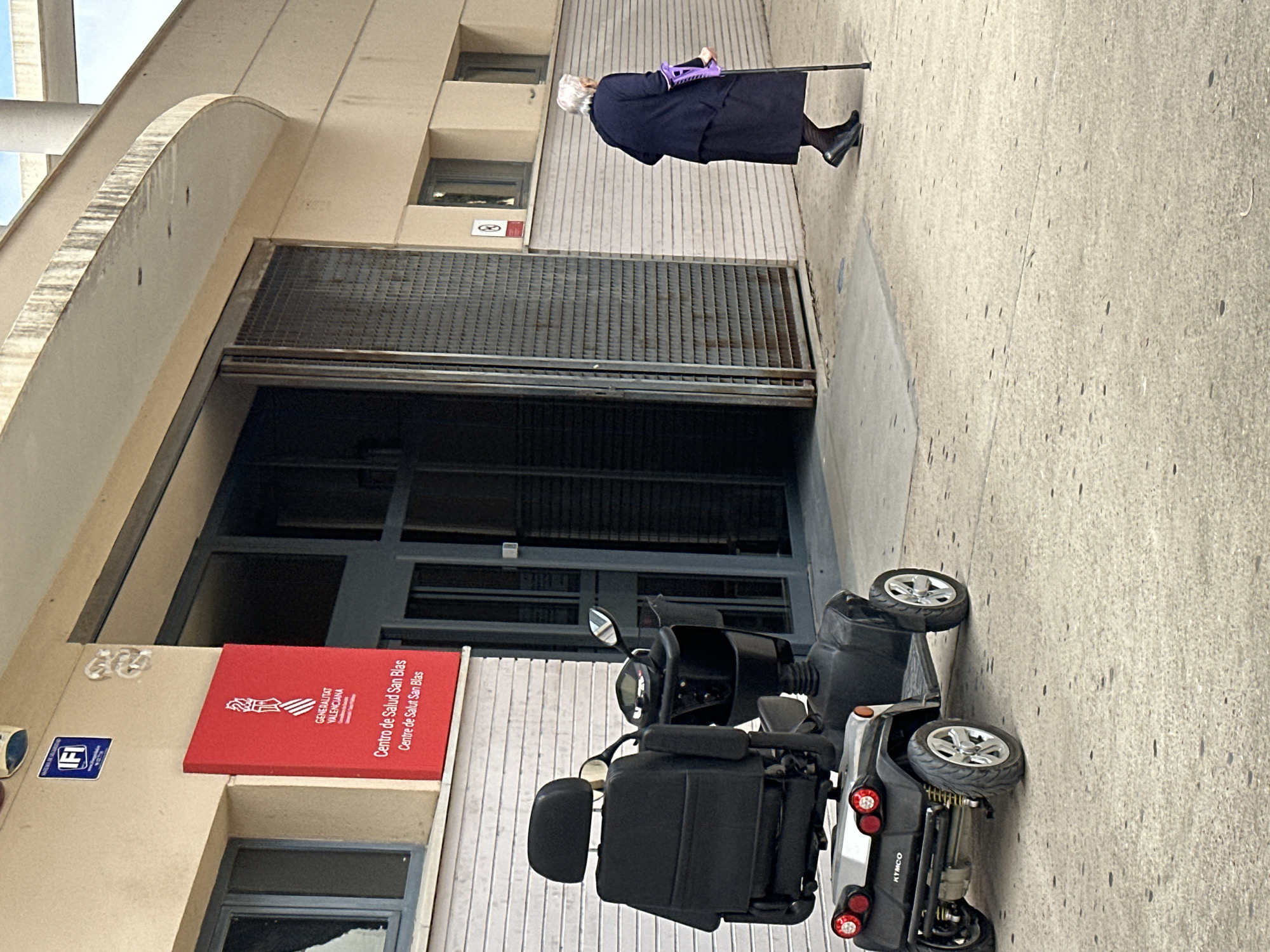 This image depicts the exterior of the Centro de Salud San Blas (San Blas Health Center) in Alicante/Alacant, Spain. The building features a light beige facade with multiple windows and a large entrance section. A prominent red rectangular sign on the building wall displays "GENERALITAT VALENCIANA" and "Centro de Salud San Blas" in both Spanish and Valencian. Above this sign, a blue square "IFI" emblem is visible. A curved concrete overhang extends from the building's upper section. In the foreground, a black, four-wheeled Kymco mobility scooter is parked facing towards the building's entrance. It features a high black seat with armrests and red rear lights. The scooter is unoccupied. To the right, an elderly person, viewed from behind, walks away from the building towards the right side of the frame. The individual has white/grey hair, wears a dark blue top, a dark blue long skirt, and black shoes, and uses a purple forearm crutch for support. The ground is light gray concrete.