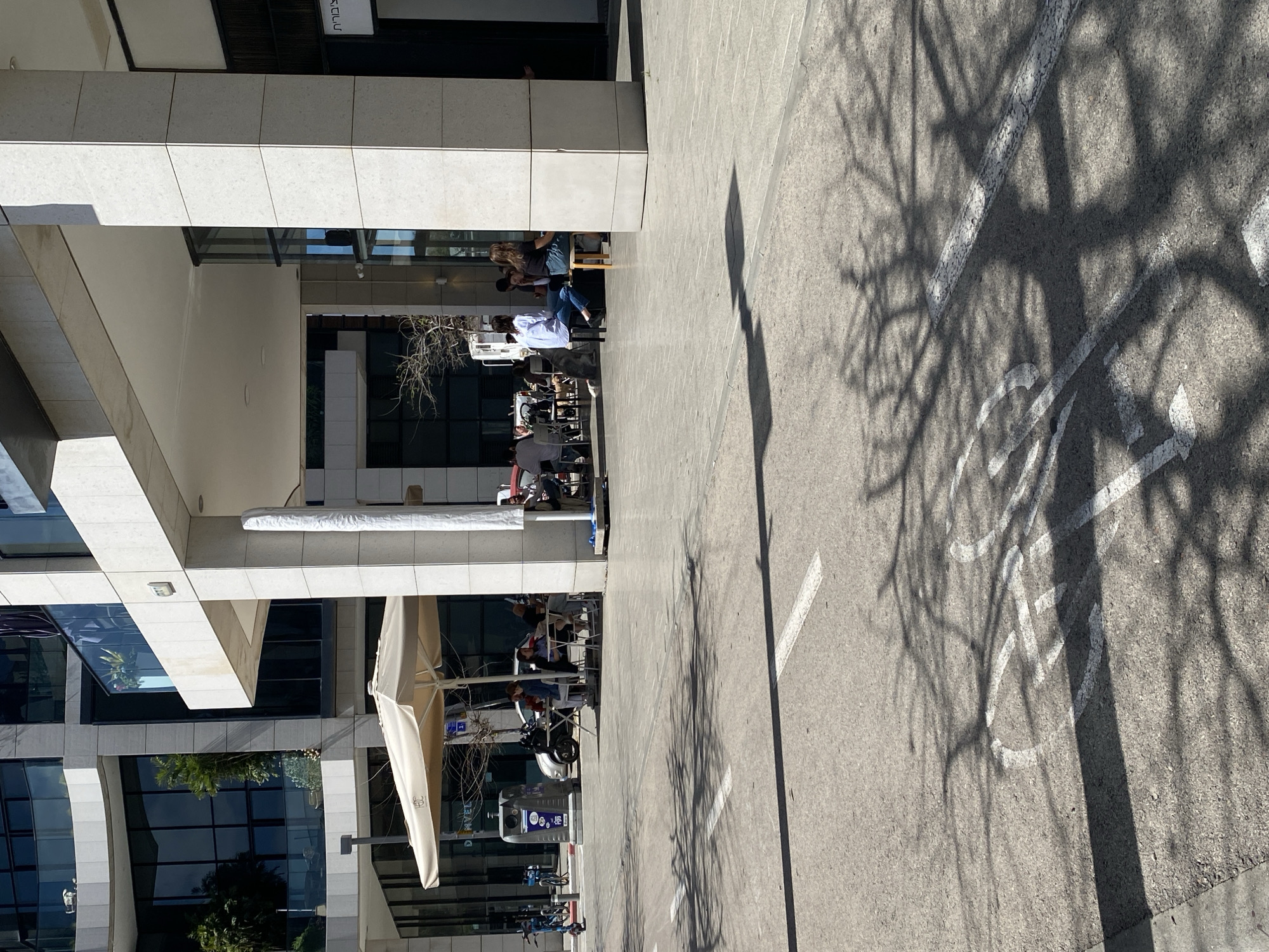 This image depicts a sunny urban street scene in Tel Aviv, Israel, likely near the Ha-Arba'a Street / Sarona Complex area, identifiable by the modern architecture and the visible "צ'ימברית" (Tz'imberit) cafe signage on a storefront. In the foreground, an asphalt surface with white painted markings is visible. These markings include solid and dashed lines, and a prominent white bicycle symbol, indicating a designated cycling path. Complex, dark shadows from an unseen tree are cast across the asphalt. The midground features an outdoor cafe patio situated under a large, beige, partially opened umbrella bearing a "HOC" logo. Approximately 15-20 individuals are seated at various small tables with chairs and wooden stools. They appear to be engaged in conversation or dining. One person in a light blue long-sleeved shirt is seated at a table under the umbrella. To the right, another individual in a white long-sleeved shirt and blue jeans sits on a wooden stool, alongside a person in a black shirt and blue jeans. Behind the cafe seating, multiple scooters/mopeds are parked, along with a blue electric scooter. A tall, gray public recycling bin with blue panels and Hebrew text ("מיחזור אריזות" - recycling packaging, "פסולת רטובה" - wet waste, "פסולת יבשה" - dry waste) stands near a dark lamppost. The background consists of modern multi-story buildings constructed with light-colored stone or concrete facades and large glass windows. Upper floors feature balconies with glass railings, some containing potted greenery. The ground floor of the building is supported by large, square, light-colored concrete pillars, creating a covered walkway or patio area for the cafe. A storefront with Hebrew lettering, "צ'ימברית," is visible on the right. The overall environment is brightly lit by direct sunlight, casting sharp shadows, suggesting a clear day.