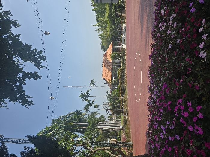The image depicts a public recreational area within Chiang Mai City Municipality, Thailand, under a clear blue sky. In the immediate foreground, a dense bed of flowering plants exhibiting pink, purple, and white blossoms occupies the lower portion of the frame. Directly behind the flowers is a segment of a reddish-brown court surface, featuring a distinct dashed white half-circle marking. To the left of the court, a metal utility structure is partially visible, situated among tall palm trees and other green foliage. In the mid-ground, a pavilion with an orange-tiled, multi-tiered roof and white support columns stands, surrounded by manicured landscaping. The background consists of various green trees and bushes. Overhead, dark tree branches partially frame the top of the scene, and multiple horizontal wires adorned with small decorative lights are strung across the sky. A tall, slender communications tower is discernible in the distant left. No individuals or explicit activities are observed within the frame.