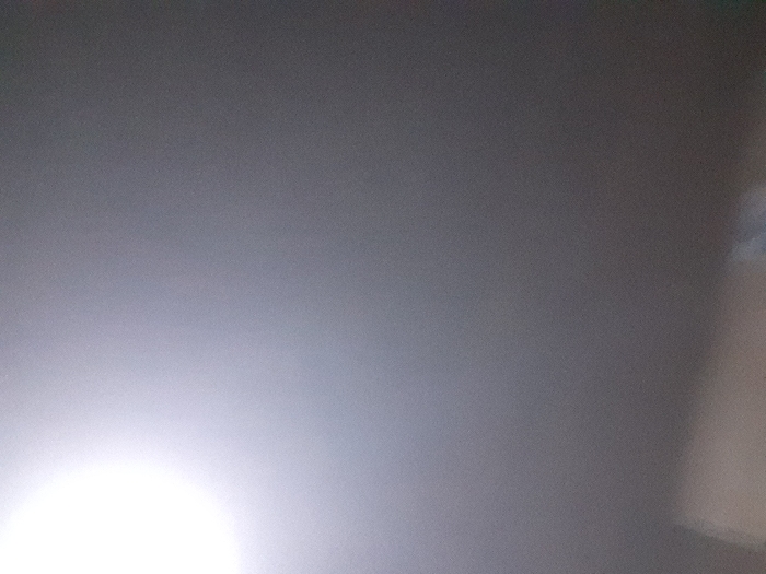 A blurry, grayish-white background with a noticeable texture. There's a bright, undefined light source emanating from the bottom left corner, obscuring details in that area. A vertical blurred section appears on the right side, suggesting the presence of an object or surface. The overall impression is abstract and lacks clear focus.
