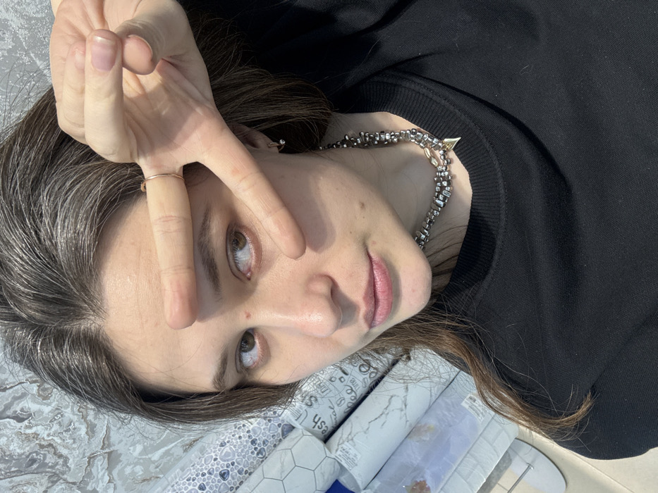 A young adult female is depicted in a medium close-up, directly facing the camera in an interior setting within Chaikovsky, Russia. Her brown hair, with noticeable gray roots, is parted centrally. She has brown eyes, a small reddish spot above her right eyebrow, and her lips are slightly parted. She wears a black long-sleeved top, a multi-strand silver and black beaded necklace with a small gold-colored triangular pendant, a gold-colored ring on her left ring finger, and a small hoop earring with a clear stone in her right ear. Her left hand is raised, forming a V-shape with her extended index and middle fingers, partially obscuring her forehead and the top of her left eye. The background consists of several vertically stacked rolls of material, consistent with wallpaper or decorative film, displaying patterns such as light gray marble, hexagons, and other designs. Partially legible text, including "fresh" and "Sh", is visible on some rolls. The environment appears to be a retail store or storage area.