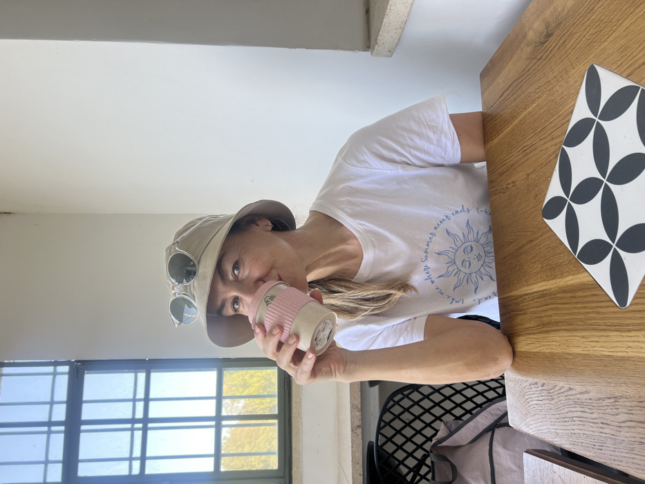 An adult female is seated at a light brown wooden table indoors, likely a cafe or restaurant in Rosh Haayin, Israel. She is wearing a beige bucket hat with round, clear-framed sunglasses perched on its brim, and a white t-shirt featuring a light blue graphic of a sun and text. Her light brown hair is visible beneath the hat. She is seen taking a drink from a light beige reusable cup with a pink silicone sleeve and lid, holding it with her right hand. Her gaze is directed towards the viewer with a slight smile. To her left, a large window with a dark grid frame overlooks green foliage and a bright sky. A portion of a dark, grid-patterned chair is visible to her left. A square coaster with a black and white geometric pattern rests on the table to her right. The background consists of a plain white wall.