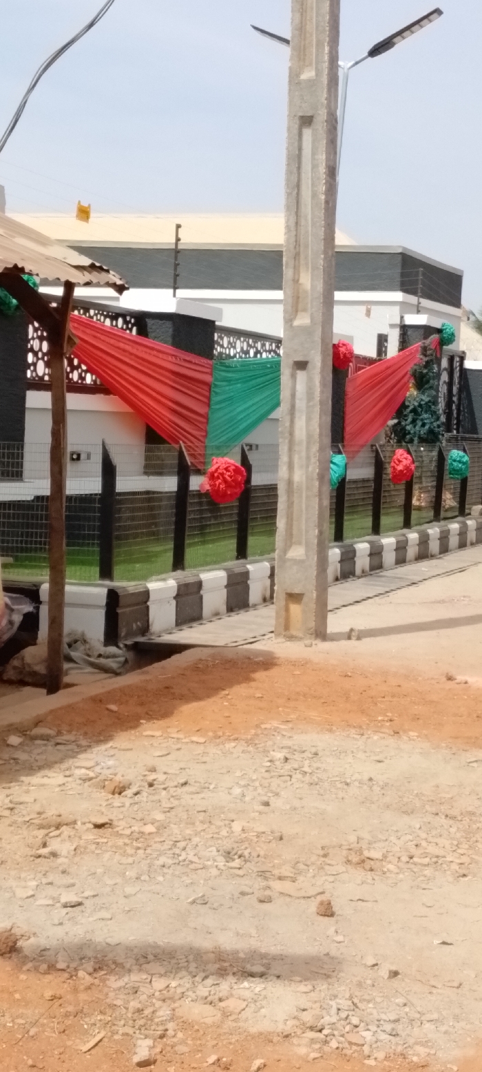 This image depicts an outdoor scene in Sabon Tasha, Nigeria. The foreground consists of unpaved, uneven ground composed of reddish-brown dirt and scattered light-colored rock fragments, with shadows indicating direct sunlight. In the midground, a black metal fence with horizontal bars and vertical posts runs horizontally, enclosing a well-maintained green lawn. Behind this fence, a sidewalk features a curb with alternating black and white stripes. A building behind the fence displays a facade with a dark lower section and an upper section featuring decorative white panels with geometric circular cutouts. Red and green fabric drapes are strung across the fence and portions of the building, accompanied by spherical red and green decorative elements attached to the drapes and fence posts. Electric fence wiring is visible along the top perimeter of the building's wall. To the far left, a partial view of a wooden structure with a corrugated metal roof is present. Dominating the right side of the midground is a tall, light-grey concrete utility pole equipped with a modern dual-arm LED street light fixture. In the background, a large, light-colored building with a dark band below its flat roofline is visible. Overhead utility lines traverse the upper left quadrant of the light blue, clear sky. No individuals or active interactions are visible.