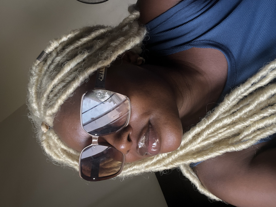 An image displays a close-up, chest-up view of an individual in what appears to be an indoor setting in Gwarinpa, Nigeria. The subject, a person with dark skin, faces slightly left and upwards from the viewer's perspective, with their head subtly tilted. They are wearing large, square-framed sunglasses with brown gradient lenses; the right temple of the frame visibly displays the "CHANEL" brand name. Their lips are glossy and appear to have a brownish tint. The individual has blonde dreadlocks, with a small, light-colored seashell bead positioned near the hairline on the left side of the head, and a dark coiled metal bead affixed to a dreadlock further back on the right side. They are dressed in a dark teal, ribbed tank top or camisole. The background is blurred and light-colored, indicating an interior space, with a faint, dark circular object partially visible in the upper right. Strong directional light illuminates the scene from the left, creating reflections on the sunglasses.