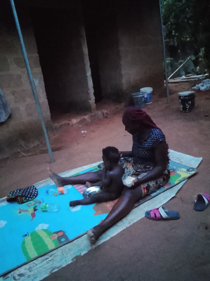 A woman and a young child are seated on a colorful mat outdoors. The woman, wearing a patterned top and a headscarf, is holding something in her hand. The child, who is not wearing clothes, sits next to her. Scattered on the mat are several plastic bottles and a polka-dotted bag. In the background, there's a simple building with dark doorways and some containers nearby. Slippers lie on the ground near the edge of the mat.