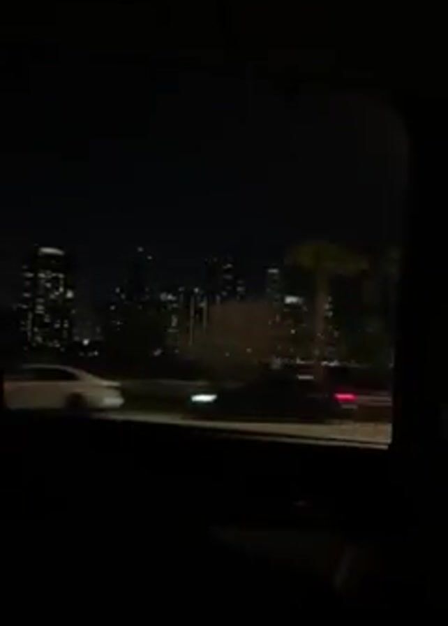 A dark video shot from inside a car shows a city skyline at night. The illuminated buildings of the cityscape are visible in the distance through the car window, contrasted by the darkness surrounding the vehicle. Some plants can be seen outside. The car appears to be moving, as indicated by the blurred movement of the city lights and roadside objects. A voice speaks in the background.