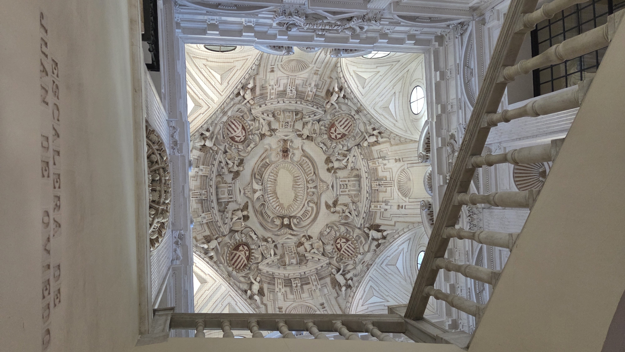 The image displays an upward view of the highly ornate Baroque ceiling and a section of a staircase balustrade inside the Hospital de los Venerables in Seville, Spain, specifically depicting the Escalera de Juan de Oviedo. The dominant feature is the intricately detailed ceiling, rendered in off-white, cream, and light beige stucco, accented with reddish-brown elements on heraldic crests. It comprises a large central oval medallion surrounded by concentric rings of elaborate decorative relief, including numerous sculpted winged cherubim and several shield-shaped crests featuring vertical striped patterns. The ceiling incorporates vaulted sections and various architectural motifs such as shell designs and pilasters, with multiple oval windows allowing natural light to illuminate the space. An inscription in capital letters, "ESCALERA DE JUAN DE OVIEDO," is visible on a flat ceiling section in the upper part of the frame. In the lower left and mid-right, a section of a light-colored, probably stone, balustrade with several classically-designed balusters ascends diagonally, indicating the presence of a grand staircase. No individuals are present.