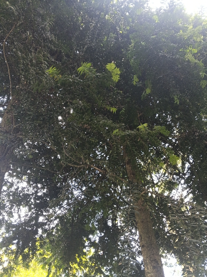 The image presents a low-angle view looking upward into a dense arboreal canopy in Tapaiteng Uesa, Bhutan