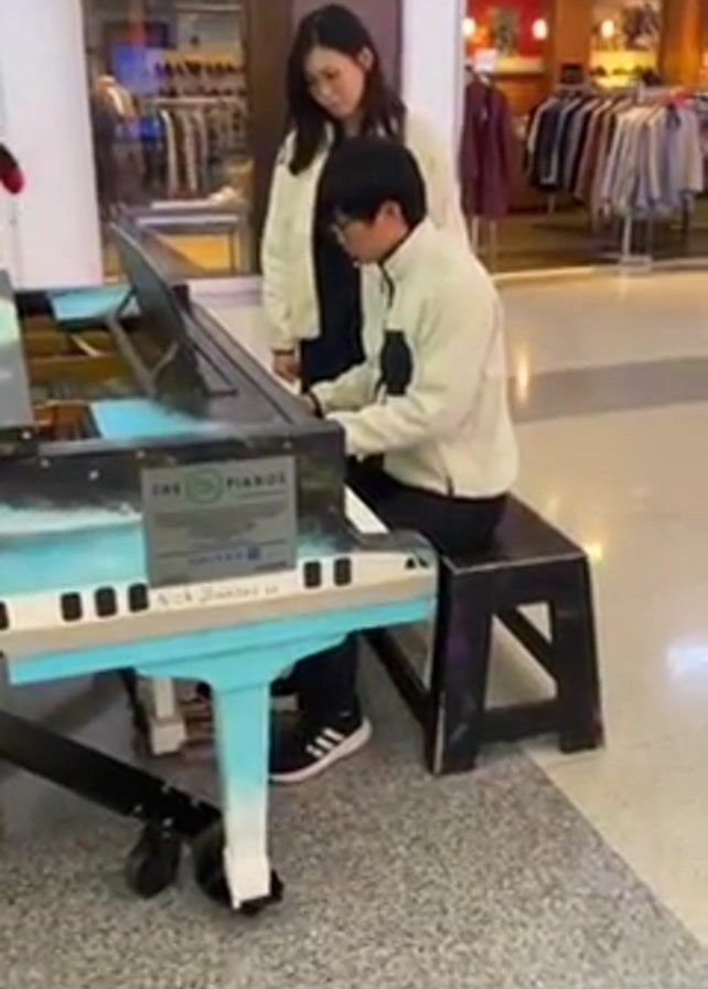 A young man plays a public upright piano with a woman standing behind him. The piano is light blue with black and white keys and is painted with a landscape mural. The man wears a white fleece jacket and dark pants and has dark hair and glasses. The woman also wears a white fleece jacket and dark pants. The woman reaches over his shoulder and places a cell phone on the music stand of the piano. The piano is in a public space, likely a shopping mall, with various storefronts visible in the background and a gray tiled floor. A man with a backpack walks past on the left.