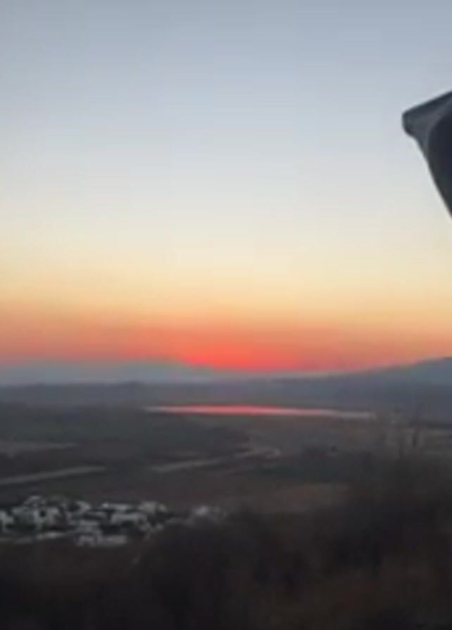 The camera is pointed at a car door, partially opened. The open door reveals a vast landscape at sunset. In the distance, a small hill, a lake, fields, and a small village can be seen. The sunset paints the sky in hues of orange and red.
