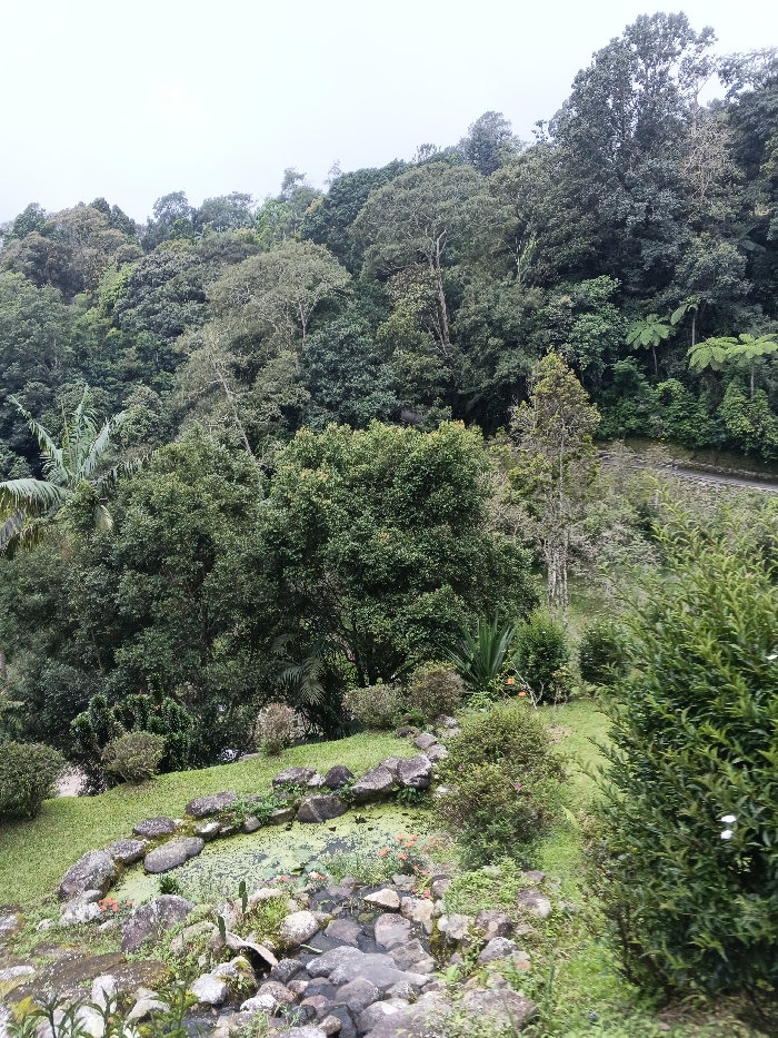 The image displays a densely vegetated, mountainous landscape in what is described as the city of Matopos, Zimbabwe, under an overcast sky. The foreground features a manicured green lawn sloping downwards, interrupted by a rock-lined, irregular water feature. This water body is largely covered by green aquatic vegetation, possibly duckweed or algae, with sporadic orange flora visible. Adjacent to it, a collection of loose rocks forms a dry stream bed in the immediate foreground. Various green shrubs and bushes, some appearing manicured, populate the foreground, including a prominent, dense green bush with small white flowers on the right and a spiky, succulent-like plant towards the left. In the mid-ground, a dark-surfaced road winds horizontally from right to left, partially visible through the foliage and alongside a stone retaining wall or embankment. Beyond the road, the terrain rises sharply into a thick, multi-layered forest composed of numerous trees and bushes of varying shades of green, including some lighter-barked or bare-branched trees and large banana-like leaves on the far left. The background is dominated by a continuous, dense canopy of mature trees covering the entire hillside, extending upwards to meet a light grey, overcast sky. No individuals, animals, or explicit human actions are visible in the scene.