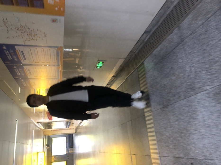 A person walks down a subway tunnel or similar underground corridor. The individual wears white sneakers, black pants, and a black jacket over a white shirt. Subway signage is visible on the left wall, and an exit sign glows green above. The corridor has a stone or tile floor, and a grated covering runs along the top right edge where the wall meets the ceiling. The image is rotated slightly.