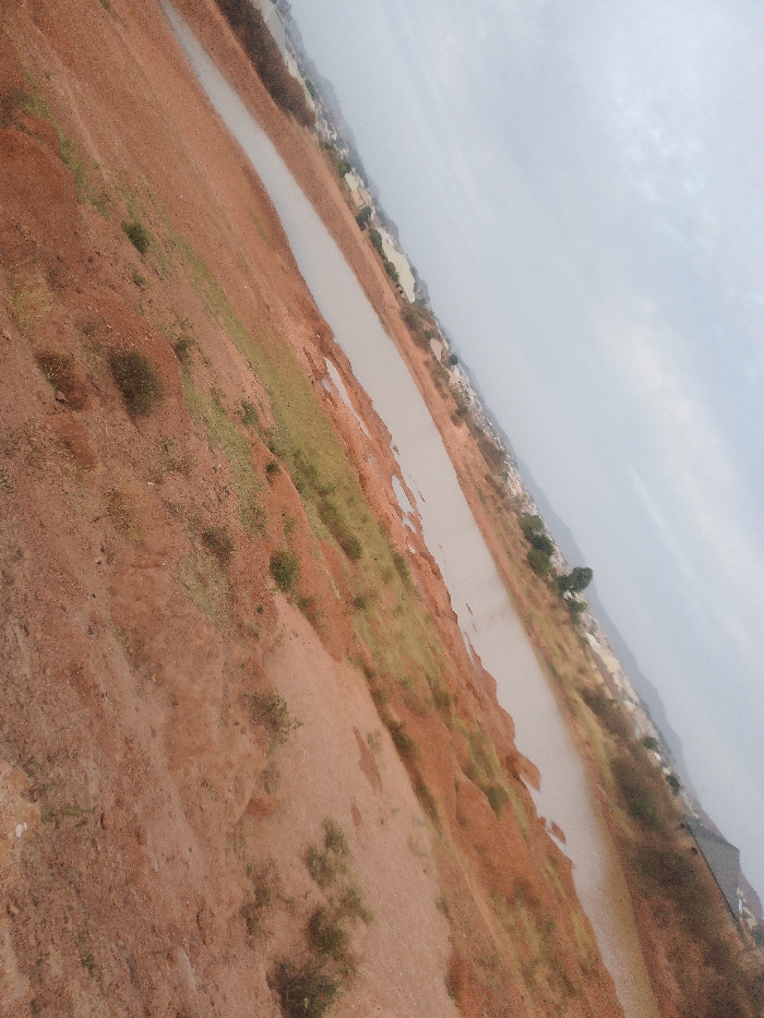 A long, straight body of water, possibly a river or canal, cuts through a landscape of reddish-brown earth and scattered vegetation. The terrain appears dry and arid with sparse green growth. In the distance, there are hints of buildings along the waterway. The sky overhead is overcast and grey, lending a somber tone to the scene. The perspective is tilted.