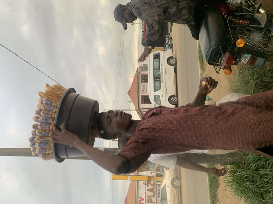The image depicts a street scene in Nyanya, Nigeria, under an overcast sky. In the foreground, a young man, facing right, is seen in profile, balancing a large, dark plastic basin on his head. The basin is filled with numerous small, individually plastic-wrapped food items, each wrapper having a translucent purple tint over the contents, likely fried snacks. He supports the basin with his raised right arm and holds a small, yellowish item in his left hand. He wears a maroon-colored, patterned tunic. Behind the central figure, a second individual in a white t-shirt is partially visible. To the right, another man, wearing a dark baseball cap and a camouflage-patterned jacket, sits astride the rear portion of a dark-colored motorcycle. He faces the central figure with his right hand raised and extended, seemingly in conversation or making a gesture. The motorcycle's rear fender, black seat, and orange turn signals are visible, along with a partially obscured license plate. In the background, a paved road stretches across the frame. A white commercial van, marked "RURAL ELECTRIFICATION AGENCY STAFF BUS," is parked or slowly moving on the road. Further left, a light-colored sedan is also visible. Several single-story or two-story buildings line the road, featuring red-tiled roofs. Visible building signs include "LUY PLAZA" on the left and "CHI DUBAI ELECTRONICS & SUPPLIES" on the right. Green shrubbery and bare earth compose the immediate ground in front of the road. A dark utility pole stands behind the central figure, with a wire traversing the upper portion of the frame.