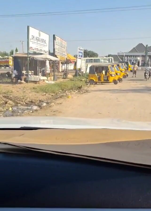 The view from inside a car shows a street corner in Nigeria on a bright, sunny day. There are several yellow three-wheeled auto rickshaws parked on the side of the road. A motorcycle drives by. A few people are visible walking. The area appears dusty with small businesses along the road. There are also several signs, including one for a medical practice.