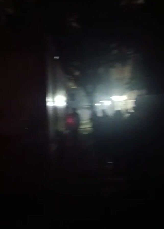 The video is dark and blurry. It appears to show a fire at night in an urban area. In the beginning the scene is too dark to make out any details but gradually reveals a building in the background. A red light is visible in the frame suggesting the presence of a vehicle. People gather in the background, their forms indistinct. A firefighter can be seen in the scene with their equipment and uniform. The words "FIRE" are visible on their uniform.