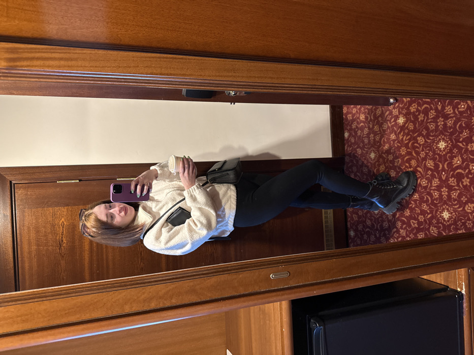 A young adult female is depicted in a full-body mirror selfie, standing within an interior space consistent with a hotel room or hallway