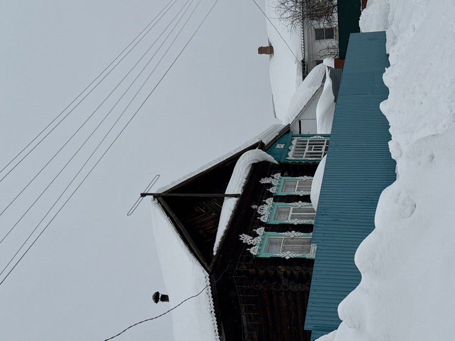 The scene depicts a snow-covered street in Noviy, Russia, under an overcast sky. In the foreground, a dark log cabin-style house is visible behind a teal, corrugated metal fence largely buried by deep snow drifts. The house features a steeply pitched, snow-laden roof with a black metal chimney on the left side and a small, two-pronged antenna mounted on the front gable. Three prominent windows on the house's front are framed in teal and adorned with intricate white carved wooden ornamentation (nalichniki). Small, dark string lights are strung along the eaves. Beyond the main house, a second, white-painted house with a brown brick chimney is partially visible, also blanketed in heavy snow. Bare tree branches are visible to the far right. Multiple dark utility wires traverse the upper portion of the frame against the light grey sky. No people or observable actions are present.