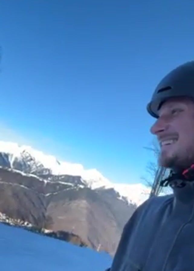 person skiing down a snowy slope on a sunny day. The person is wearing a gray jacket, a black helmet, and is smiling. The background features snow-capped mountains and a clear blue sky. Bare trees are visible on the slope alongside the skier. The video appears to be taken from a first-person perspective.
