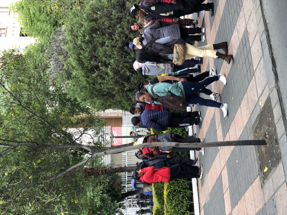 The image displays an outdoor public area in La Paz, Bolivia, located in front of the Palacio de Justicia, identifiable by the partially visible "JUST" lettering on the building in the upper right background. The foreground features a paved pedestrian walkway constructed from alternating dark gray and light brown square tiles. A slender, leafless tree trunk stands centrally in the foreground, rooted in a small dirt patch. Approximately 20-30 individuals, primarily adults of varying ages, are present, either standing or walking on the paved area. Their attire is casual and includes jackets, sweaters, and long pants. On the far left, behind a green hedge and a white metal fence, uniformed personnel, possibly police or security, are partially visible near blue tarpaulins. Notable individuals include a woman in a light green hooded jacket and blue jeans, carrying a brown backpack, walking towards the right in the mid-ground. Another woman in a red jacket and dark pants stands to the left, with her hands near her face. A woman in beige pants and dark brown boots, carrying a beige shoulder bag, walks towards the right in the foreground. The mid-ground and background feature dense green vegetation, including large shrubs and trees. A multi-story building with light-colored walls and windows is partially visible through the foliage, and a banner displaying red, yellow, and green horizontal stripes is partially obscured by trees. A curb runs along the bottom edge, indicating an adjacent street. The scene is illuminated by natural light, suggesting an overcast day.