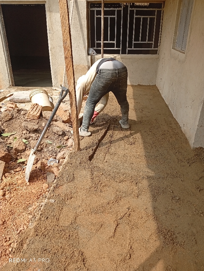 The image displays an outdoor construction site in Ube, Nigeria. One individual, positioned centrally and viewed from behind, is bent forward at the waist, engaged in ground-level work. The person wears a light cream-colored long-sleeved shirt, dark grey jeans, and light grey athletic shoes. A light grey waistband is visible above the jeans. The ground surface is bifurcated. The left foreground and mid-ground consist of disturbed reddish-brown earth mixed with scattered debris, including brick fragments and an overturned white plastic bucket. A black-handled shovel with a metallic blade rests within this area. The right side and central foreground feature a uniform layer of fine, light brown sand or aggregate covering the ground. In the background, an unfinished building structure is visible. It features a dark, open doorway on the far left. Central to the background is a window fitted with dark metal security bars arranged in a rectangular grid. To the right of the window, a plain, light-colored wall section is present. A vertical light brown wooden beam stands in the mid-ground, positioned between the doorway and the working individual. Strong sunlight illuminates the scene, evidenced by clear shadows.