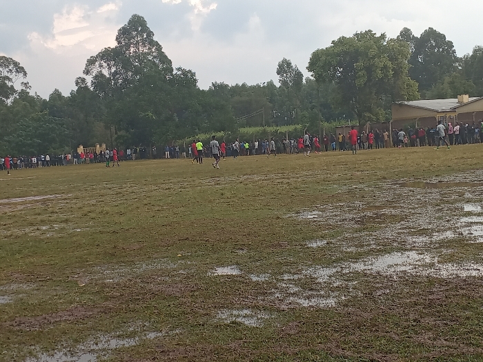 A muddy field hosts a soccer game with players spread across it. Spectators line the perimeter. Trees form the background under a cloudy sky. A building is seen on the right side. Water pools are visible on the ground, indicating recent rain.