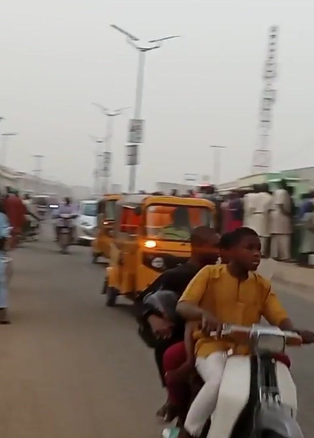 The video depicts a busy street scene in what appears to be a developing country, possibly Nigeria based on the visible vehicle markings. The road is filled with motorcycles, yellow auto rickshaws (tuk-tuks), and a few cars. People are walking along the roadside. The sky is overcast, suggesting a hazy or possibly polluted atmosphere. In one brief segment, smoke can be seen rising from behind a building, though the source of the smoke is not clear from the footage. The overall impression is of a densely populated urban area with active traffic.