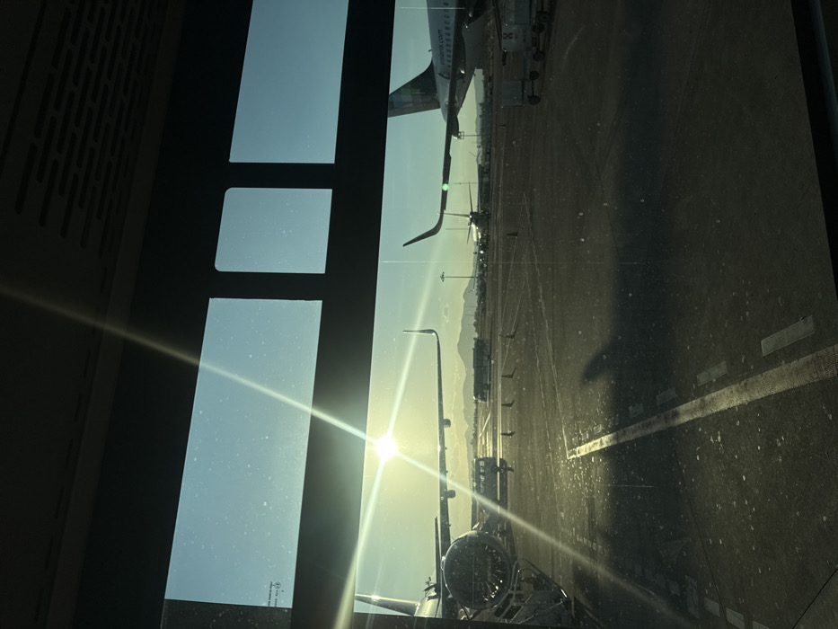 An airport tarmac is seen through a window with distinct panes. Several aircraft are visible, some parked and others possibly taxiing. The sun is bright, creating a strong lens flare and casting shadows on the ground. Mountains are faintly visible in the distance. The ground appears to be concrete or asphalt, marked with white lines.
