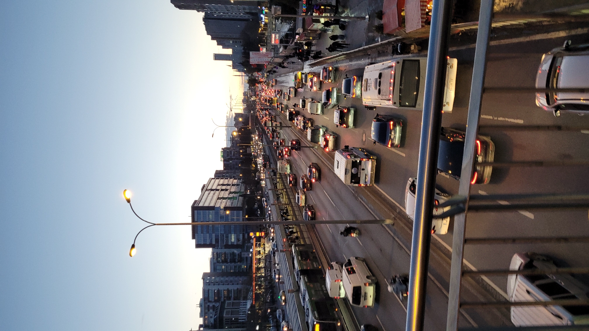 n elevated view of a busy highway in Esenyurt, Turkey, at dusk. The highway is congested with vehicles, mostly cars and vans, moving slowly in both directions. Buildings line the left side of the highway, illuminated by streetlights. Pedestrians are visible on the sidewalk along the right side of the highway. The foreground contains a portion of a pedestrian bridge or overpass, with metal railings visible. The sky transitions from a light blue to a yellowish hue near the horizon.