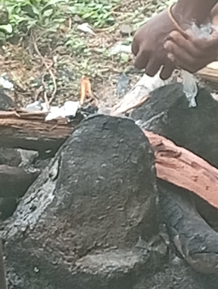 This image captures an outdoor scene in Madalla, Nigeria. A pair of dark-skinned hands occupies the upper right, with a light-colored bracelet visible on the left wrist. The hands are cupped, actively manipulating a small quantity of white, fibrous or powdery material. Below the hands and slightly left of center, a small orange-yellow flame or glowing ember indicates a ground fire. This fire is contained by dark, irregularly shaped objects, likely rocks or charred wood, around which unburnt wooden pieces are arranged as fuel. White plastic bags and debris are scattered on the dirt ground and among the fire structure components. The background consists of green vegetation and additional refuse.