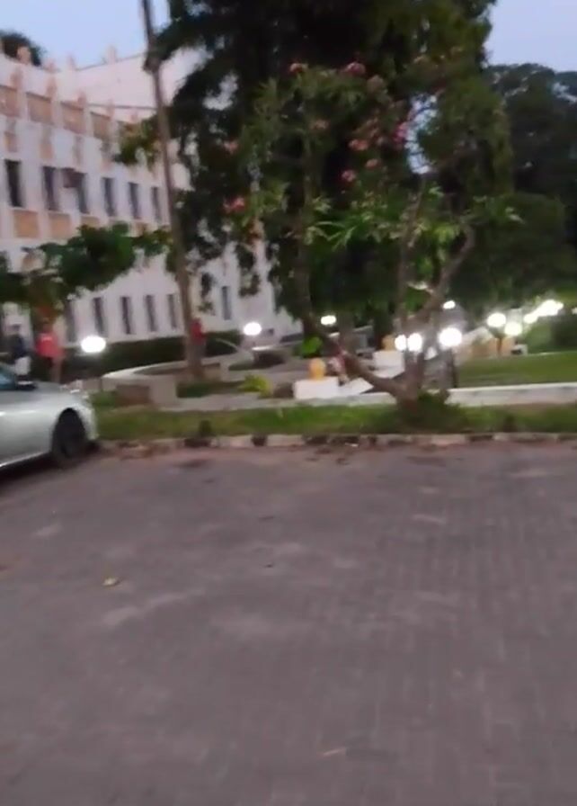view of a parking lot in front of a park with a building in the background. The parking lot is asphalt and has a car parked on the left side. There are some trees and bushes in the park, and a decorative archway with green lighting is centered in the park. The archway reads “FEDERAL UNIVERSITY OF OYE-EKITI”. There are also some lights illuminating the park. There are some blurred figures walking in the background. The sky is getting dark, suggesting it is either early morning or evening. The camera is focused on the park and the archway.