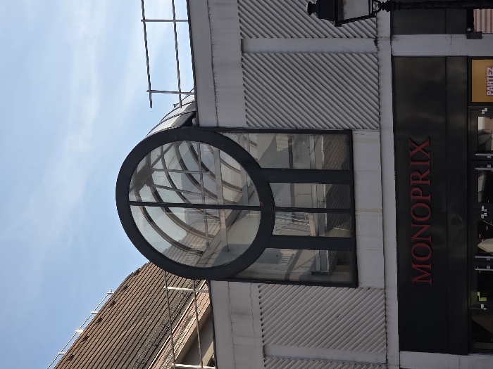 The image depicts the upper and mid-sections of a commercial building facade in the city of Unknown, Unknown, under a blue sky with scattered clouds. A prominent architectural feature is a large, dark-framed, circular glass window or skylight structure, integrated above an arched, multi-pane glass section. This glass assembly is set into a light grey building facade. To the upper left, a brown tiled, sloped roof is visible, along with a metal railing. To the right of the glass structure, the building facade is light grey with a textured pattern of diagonal parallel lines. Below the glass section, a black sign displays "MONOPRIX" in red capital letters. Beneath the sign, reflective entrance doors are visible. A yellow sign, partially showing "PARTEZ," is positioned to the right of the doors. A black, ornate street lamp is partially visible on the far right. No individuals, specific actions, or interactions are present in the scene.