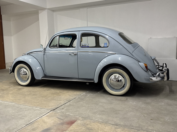 A light blue classic Volkswagen Beetle sits on a concrete floor in a garage. The car is in excellent condition, with shiny chrome accents and white-walled tires. The smooth, rounded shape of the Beetle is well-preserved, and the car appears to be a vintage model. The background is a plain white wall with subtle shadows, emphasizing the car as the main focus.