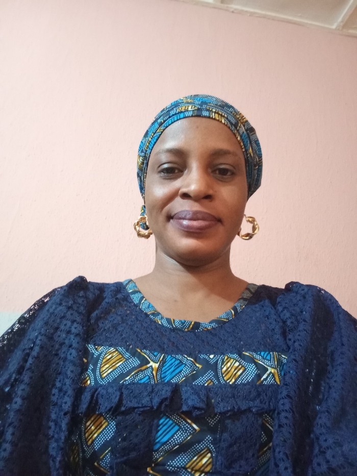 A woman is centered in the frame, facing the camera. She wears a blue patterned headscarf and large gold hoop earrings. Her dress is a dark blue fabric with lace detailing and patterns in shades of blue, yellow, and white. The background is a plain, light pink wall. Her expression is neutral.