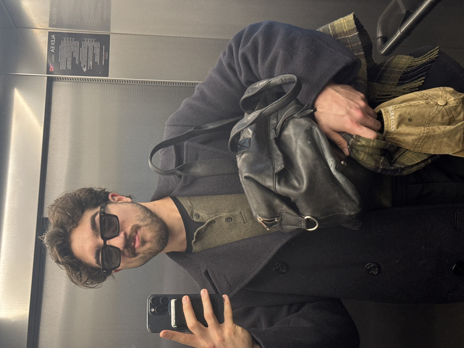 A male individual is depicted in a full-frame selfie, taken within an elevator cabin in Sofia, Bulgaria. He has medium-length wavy brown hair, a brown beard, and mustache, and is wearing dark rectangular sunglasses. He is dressed in a dark blue pea coat over an olive-green ribbed henley shirt, with a black undershirt. His left hand holds a dark-colored smartphone, equipped with a white accessory on its back, positioned to capture the selfie. His right arm and hand are laden with personal items: a large, distressed black leather duffel bag, a green and black plaid scarf, and a khaki baseball cap with white embroidery (partially visible as "POLO RLPB"). The individual exhibits a slight smirk or pursed-lip expression while looking directly into the phone's camera. The elevator interior features reflective metallic walls. On the right wall, a silver panel is visible, displaying "EXIT" and "АЛЕКСА" (ALEXA) in Cyrillic, along with a multi-line notice in Bulgarian, beginning with "ВНИМАНИЕ" (ATTENTION), indicating a regulatory or informational sign specific to the building, likely a commercial or residential complex, possibly Hotel Alexa or Alexa Apartments, within the city of Sofia.