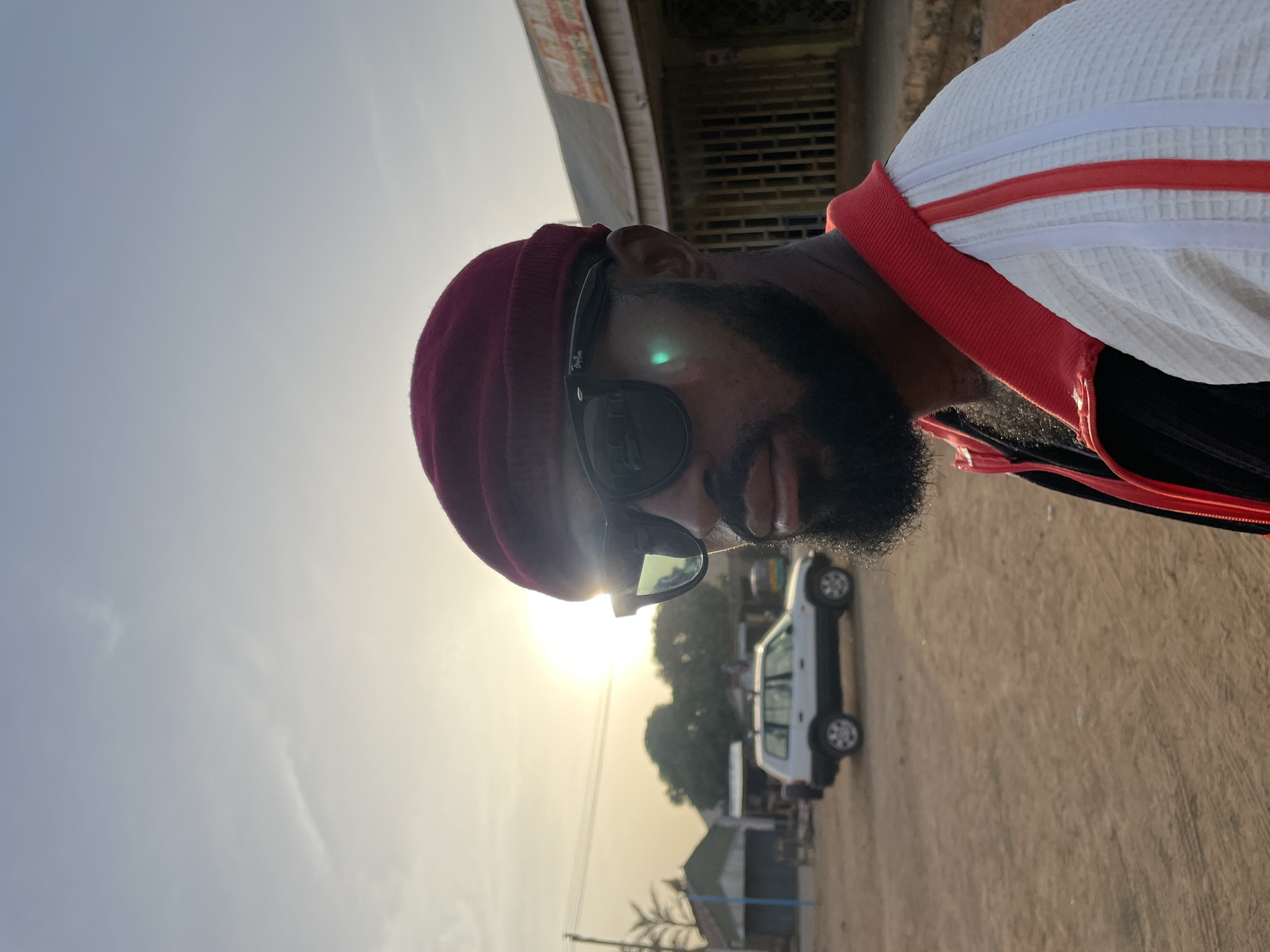 The image captures a male subject in Barakin Akawo, Nigeria, posed outdoors at what appears to be late afternoon or early morning. The subject, a dark-skinned male with a prominent black beard and mustache, is seen from the chest up, facing slightly right and looking towards the viewer. He wears a dark red beanie, dark Ray-Ban sunglasses, and a white, textured jacket with a red collar and vertical red and white stripes on the shoulder. A green lens flare is visible on his right sunglass lens, caused by the sun positioned low in the sky, to the left of the frame. The background consists of a dusty, light brown ground with visible tire tracks. Behind the subject, a white compact SUV with a black lower body is parked. Further back, several single-story buildings with light-colored roofs are visible, along with sparse trees and utility poles with overhead wires. A commercial building with a barred window and a corrugated metal roof is partially visible to the subject's right. The sky transitions from a pale blue at the top to a warm yellow-orange hue near the horizon due to the low sun.