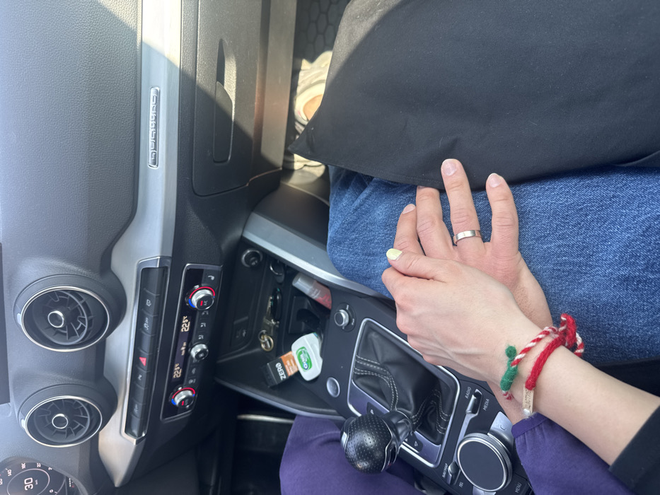 An interior view of a modern vehicle, specifically an Audi indicated by the "QUATTRO" emblem on the dashboard, is depicted in Dermantsi, Bulgaria. The image shows the center console and the upper legs and hands of two individuals. The dashboard is dark grey with a silver trim, featuring two circular air vents, a hazard light button, and climate controls displaying 22.5 °C for both sides. The speedometer is partially visible on the left, showing "30." On the center console, an automatic gear shifter with a black knob and silver base is present. A storage compartment in front of the gear shifter contains a set of keys, a white and green container labeled "ZERO Oral-B," and a translucent tube with a red cap. Two hands are interlocked over the center console area. The hand on top, belonging to an individual wearing purple trousers, has a woven red and white bracelet with a green pompom and a metal tag partially legible as "BAPTIS." The hand underneath, belonging to an individual wearing blue jeans and a black garment over their lap, features a plain silver band ring on the fourth finger and pale yellow nail polish on the thumb. A black rubber floor mat is visible in the passenger footwell. Natural light enters from the right side of the vehicle.