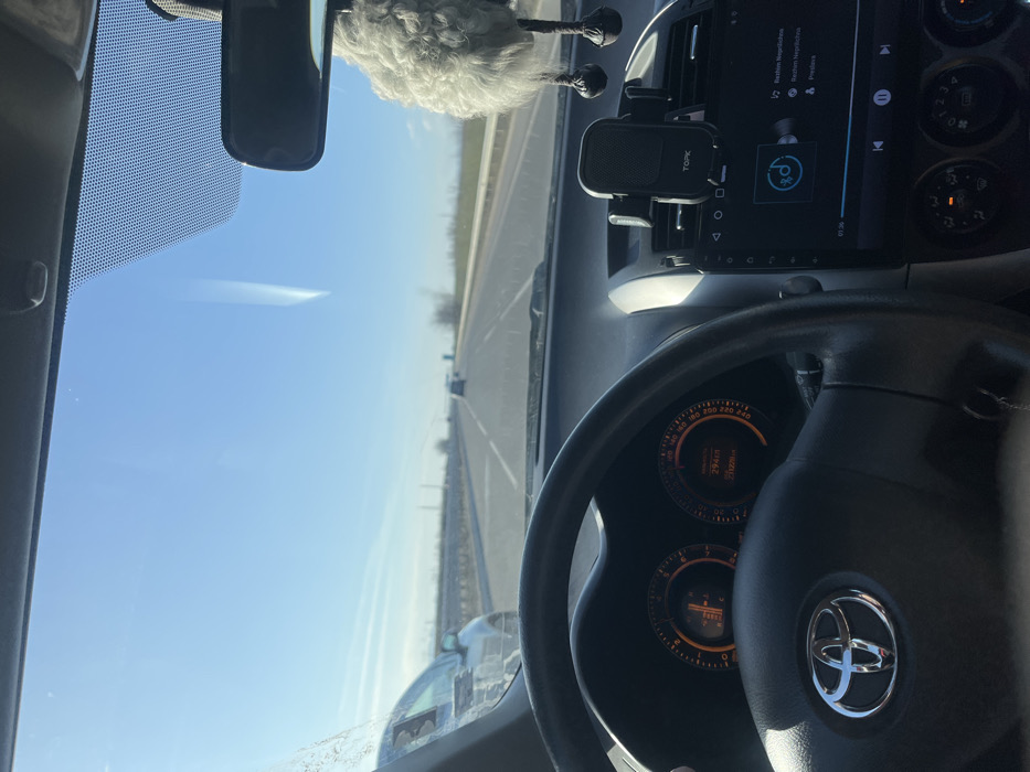 The image displays a driver's perspective from inside a Toyota vehicle traveling on a multi-lane highway in Unknown, Unknown