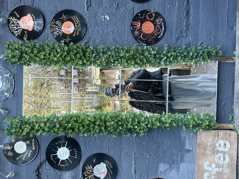A person is captured in a selfie within a multi-panel mirror set against a dark blue-grey brick wall. The individual wears a dark baseball cap, a light-colored hoodie, a black puffer jacket, and light grey wide-leg pants, holding a smartphone to take the picture. A small black cross-body bag is visible. The mirror is flanked by vertical strips of artificial green foliage. The surrounding wall is decorated with seven black vinyl records, hand-painted with abstract designs and text in Ukrainian, and strung with clear bulb lights. A partial wooden sign bearing the word "Coffee" in white paint is visible at the bottom left. The mirror reflects an outdoor urban environment featuring autumn-colored trees, multi-story buildings with windows and air conditioning units, under a clear sky. This scene is located in the city of Odesa, Ukraine.