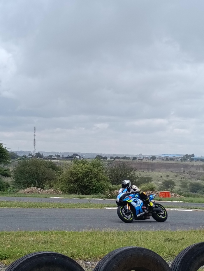 An outdoor scene depicts a lone individual riding a blue and black Suzuki sport motorcycle on a paved track under an overcast sky in Matathani ward, Kenya