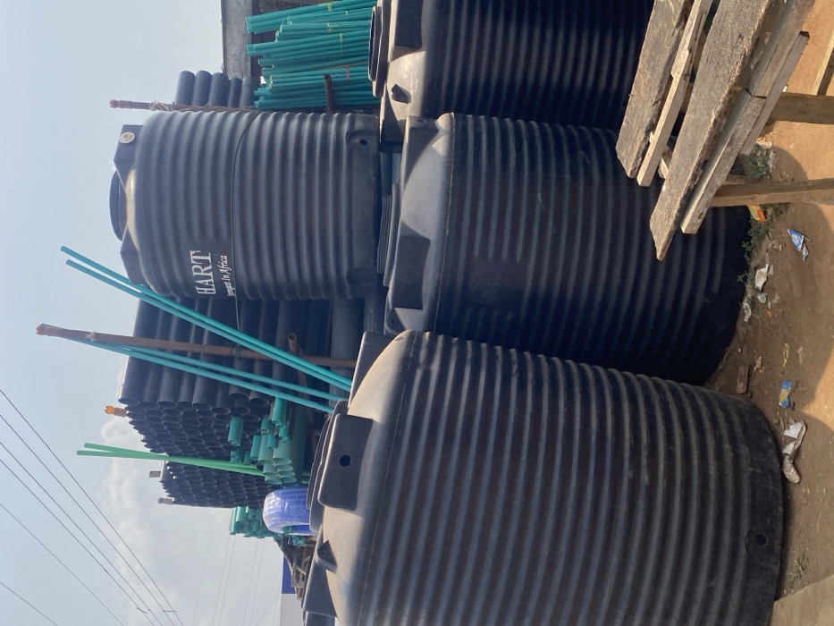 This scene, located in Igbessa, Nigeria, depicts an outdoor commercial or storage area under a hazy sky. The foreground features multiple large, black, horizontally ribbed plastic water storage tanks. One tank prominently displays "HART" and "Strongest In Africa" in white text. Behind these tanks, numerous black and green plastic pipes are stacked horizontally. Several light green and blue plastic pipes, along with rough wooden poles, are positioned vertically amongst the pipe stacks. A roll of blue material is also visible within the pipe stacks on the left. The ground consists of bare earth with scattered minor debris, including paper and plastic wrappers. A rudimentary wooden table or workbench, composed of two rough planks on wooden supports, is partially visible in the lower right. No individuals are present in the image.