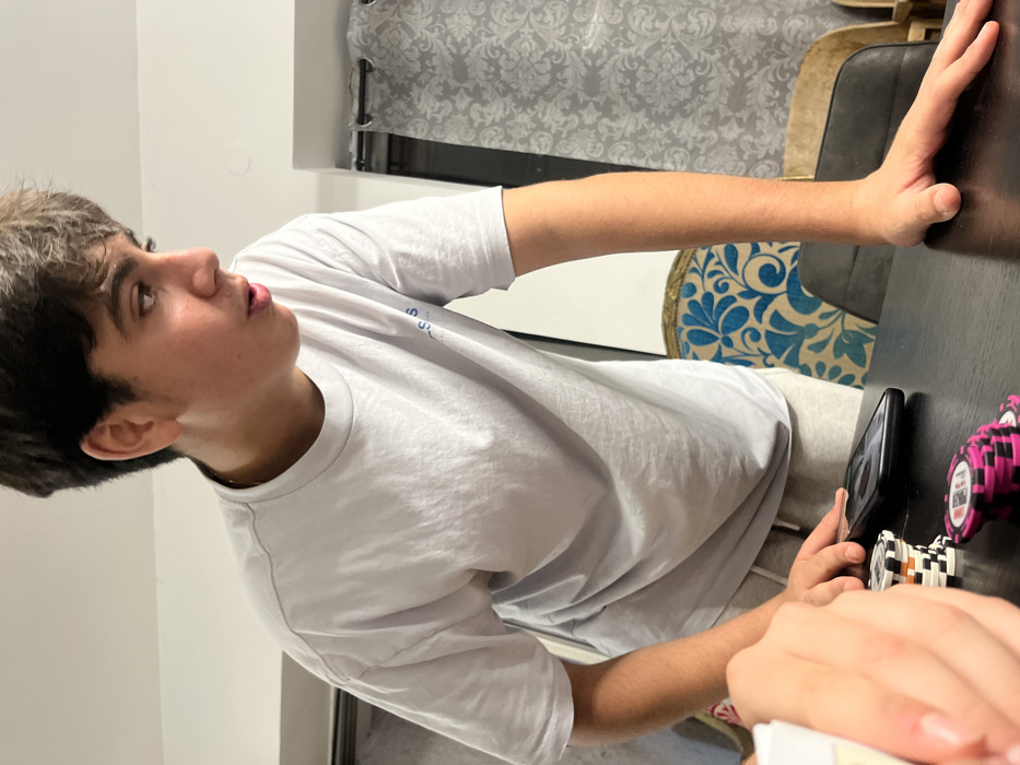 A young boy with short brown hair and a white t-shirt looks upwards and to the left. His left arm is extended onto a black table where poker chips and a smartphone are placed. A hand is seen partially in the lower right corner holding cards. A patterned chair is partially visible in the background, as is a decorative window covering. The boy is positioned on the left side of the frame.