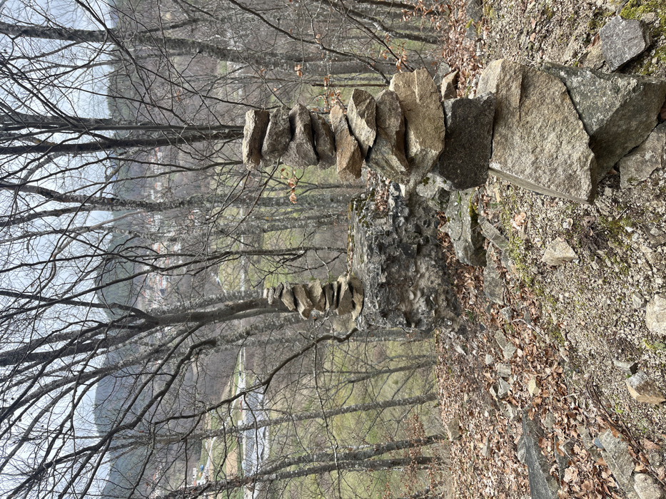 The image displays a rocky, forested hillside overlooking a valley in Taran, Bulgaria, under overcast conditions. In the immediate foreground on the right, a cairn is constructed from approximately eight stacked, irregularly shaped rocks of varying grey and tan hues, reaching an estimated height of one meter. A second, smaller cairn, composed of six stacked rocks, is visible in the mid-ground, situated atop a large, craggy grey rock formation. The ground surrounding these structures is covered with an accumulation of dry, brown deciduous leaves, loose stones, and patches of sparse green growth. Numerous bare-branched deciduous trees, characterized by light grey and brown trunks, populate the mid-ground and background, partially obscuring the view. Through the tree cover, a valley unfolds, revealing green fields, scattered buildings indicative of a settlement, and a large, dark, rectangular surface in the mid-distance, possibly a solar array or agricultural infrastructure. Distant hills frame the upper background. No individuals or dynamic actions are present within the scene.
