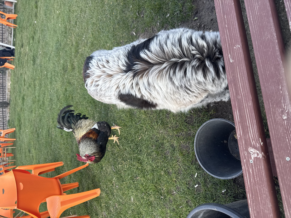 An outdoor scene in Bachkovo, Bulgaria, features a grassy area with multiple subjects. In the lower foreground, a dark reddish-brown wooden bench or railing spans horizontally across the frame. Behind this, to the left, two black plastic pots are positioned on the grass. To the right, the upper back and hindquarters of a large, shaggy dog are visible; its head is out of frame, pointing downwards towards the ground. The dog exhibits a coat pattern primarily of white or light grey with prominent black patches along its spine and sides. To the left of the dog, a rooster stands on the grass, facing towards the left side of the image. It displays a red comb and wattle, a black and iridescent green tail, and a body with dark brown, black, and lighter golden-grey plumage. The ground consists mainly of green grass, with some areas of exposed soil near the dog and pots. In the background, several bright orange plastic chairs are visible on the grass, suggesting an outdoor seating arrangement. A dark fence or hedge line is present along the far background. Small white fragments, consistent with discarded cigarette butts, are scattered on the grass near the black pots. No human figures are present.