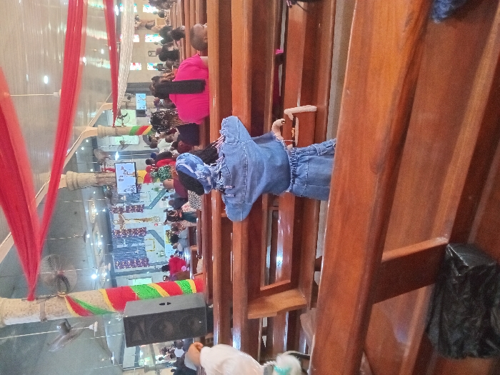 A vibrant church interior features rows of wooden pews, some occupied by congregants. A red drape hangs from the ceiling. The pews are oriented towards a central area where a stage is visible, adorned with red, yellow, and green decorations. A large screen displays content. A person's jacket hangs on the pew. The image gives a vertical perspective looking down over the scene.