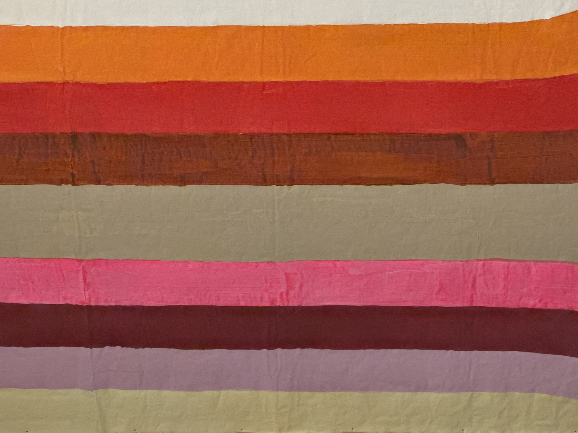 The image presents an abstract, full-frame composition of nine vertical color stripes. From left to right, the colors are pale beige, light lavender, deep maroon, vibrant fuchsia, medium taupe, rusty brown, bright red, bright orange, and off-white. The stripes exhibit variations in width and a textured surface consistent with fabric or painted material, including minor creases and subtle color irregularities. No individuals, specific objects beyond the colored strips, or discernible actions are present. The scene lacks a defined environment beyond the abstract pattern. The provided image offers no visual information to identify a specific location in Vila Nova de Gaia, Portugal.