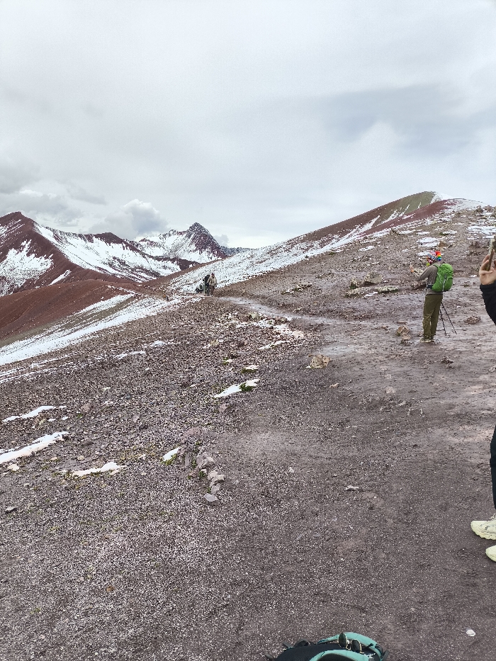A mountainous landscape displays snow-covered peaks in the distance. A path winds across a reddish-brown, rocky terrain. Patches of snow are scattered along the ground. A person with a green backpack stands on the path with a tripod. Others are further up the path, and two individuals with hiking poles are partially visible near the bottom right of the frame. The sky is overcast.