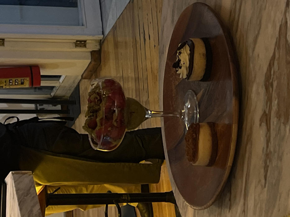 The image depicts an indoor scene within a commercial establishment in Mexico City, consistent with a restaurant or dessert shop. A marble-patterned tabletop occupies the foreground. Centrally, a round, dark wooden serving platter holds three desserts. A large stemmed glass contains red fruit, possibly strawberries, topped with a green, textured substance. The glass stem features a green liquid. Flanking the glass are two smaller, round individual desserts resembling mini cheesecakes. The left dessert has a light-colored body and a brown crumbly topping. The right dessert has a dark base, a light-colored filling, and a white whipped topping garnished with dark crumbs. In the background to the left, the lower torso and legs of an individual wearing yellow pants and a dark apron are partially visible, positioned behind what appears to be a counter or bar area. The floor is constructed of light-colored wood. To the right, a white door frame and a glass door are visible, with a red fire extinguisher mounted on the adjacent wall. The lighting is subdued.