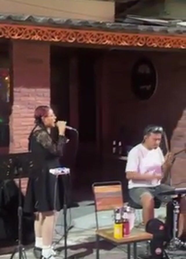 singer performing with a keyboardist outside a bar. The singer is a woman wearing a black dress, white tights, and Mary Jane shoes. She is standing at a microphone and singing. The keyboardist is a man wearing a light pink t-shirt and shorts. He is seated at a keyboard and playing along with the singer. The bar is decorated with Christmas garlands. People are seated at tables, eating and drinking. The overall atmosphere is lively.